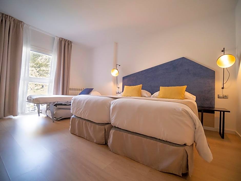 Family Suite of 131 ft² with capacity for up to 5 people, separate bedroom and views of the Canillo's Valley. It has wifi, heating, safe, 2 flat screen and satellite TV, separate living room with sofa, water, coffee/tea set, Nespresso + capsules, private bathroom with jacuzzi, hair dryer, superior amenities, bathrobe, slippers. Secondary bathroom with shower and SPA tickets